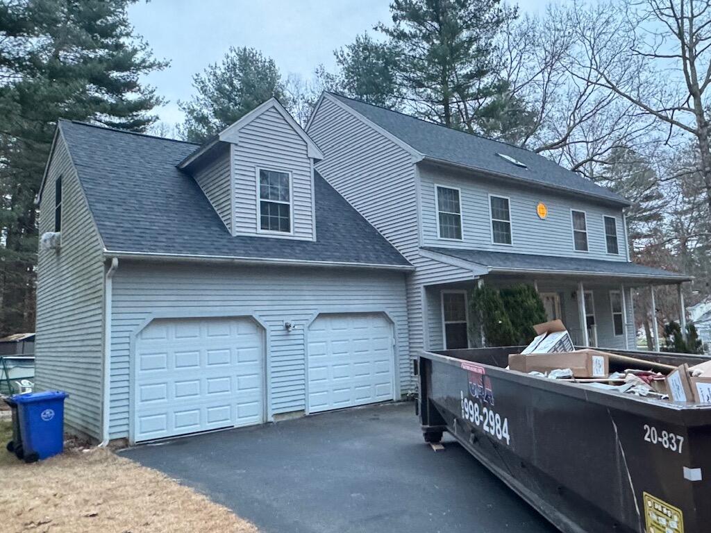 A beautiful transformation for this home's roof in Mansfield Center, CT with a full Klaus Larsen Roofing System! This homeowner chose us to replace their 29-year-old asphalt roof as well as the roof above their garage. We first replaced any damaged plywood and renailed the existing decking with Ring Shank Nails, a higher quality nail that is a cross between a nail and a screw and won't come out in high winds. We then laid down our Klaus Larsen Roofing SealoronXT Ice & Water self-sealing membrane to create a moisture barrier between the decking and the shingles. We also added 100 extra feet of Ice & Water for the lower slope roof on left rear of house. For even more protection, we installed our own Velora One Underlayment, a high performance synthetic underlayment designed to protect the home in even the most severe weather. We also took the extra step to protect the home by taping the plywood steams with our all-weather SealoronXT Deck Tape. It's the Klaus Roofing Way! To top it off, for new asphalt shingles, we installed IKO Dynasty Architectural Shingles featuring a 1-1/4" nailing area made with a tough reinforcing woven band for incredible nail-holding power to protect the home against Mother Nature's fury. The homeowner choose the shingle color Emerald Green for their new roof.
