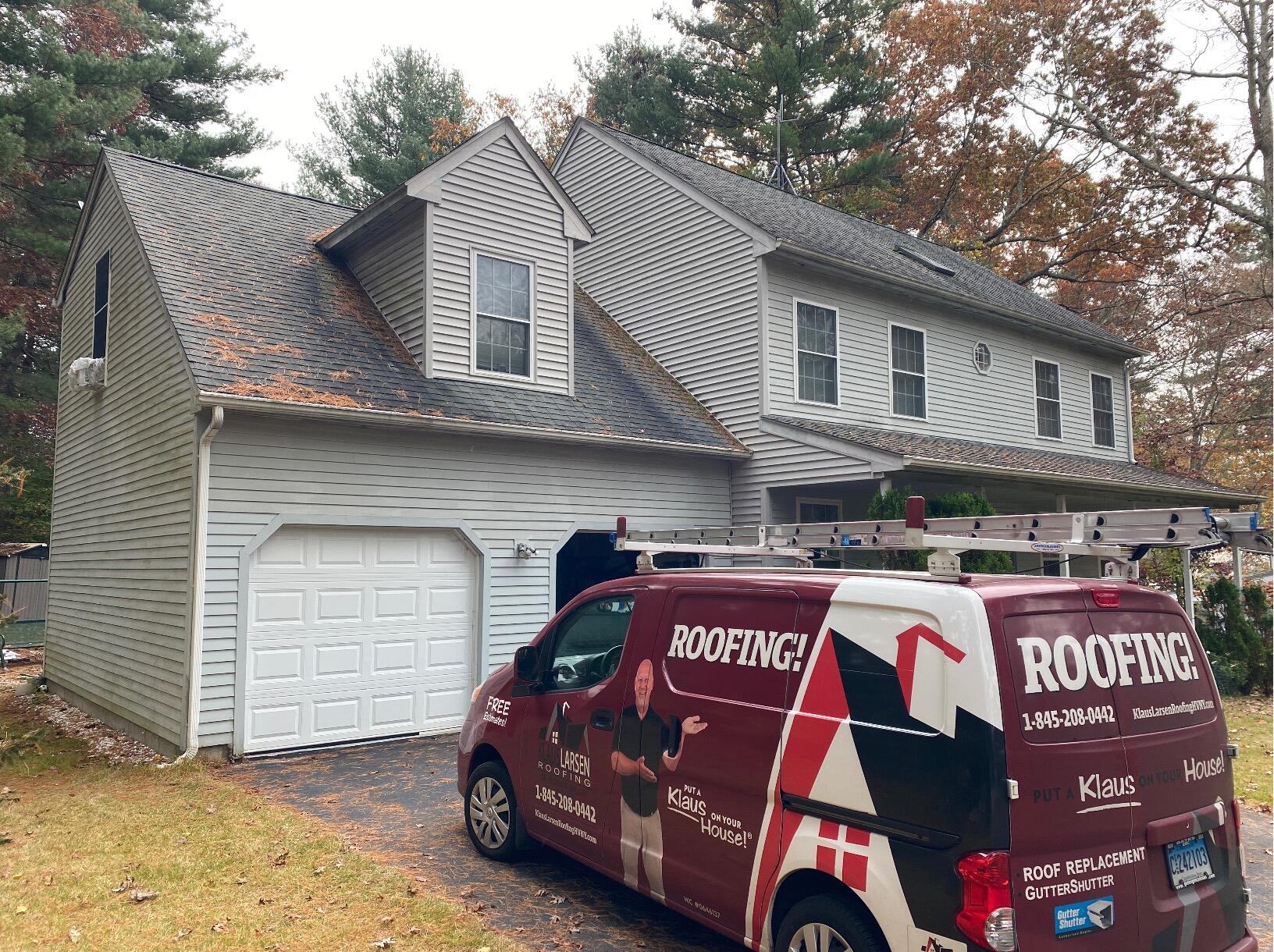 Holly from Mansfield, CT, was in the market for a new roof installation on her home. Klaus Larsen Roofing came highly recommended, so she reached out for a free roof estimate and quote. In the process of upgrading her home, Holly wanted the best quality materials and highly trained staff to handle the job. In the before photo, you can see dark, unsightly streaks from weathering, tearing down the old shingles. At Klaus Larsen Roofing, we use IKO Dynasty shingles for our shingle roofing system, which are anti-algae and have built-in protection. The granules in these shingles help inhibit the growth of blue-green algae, which causes those black streaks and stains.