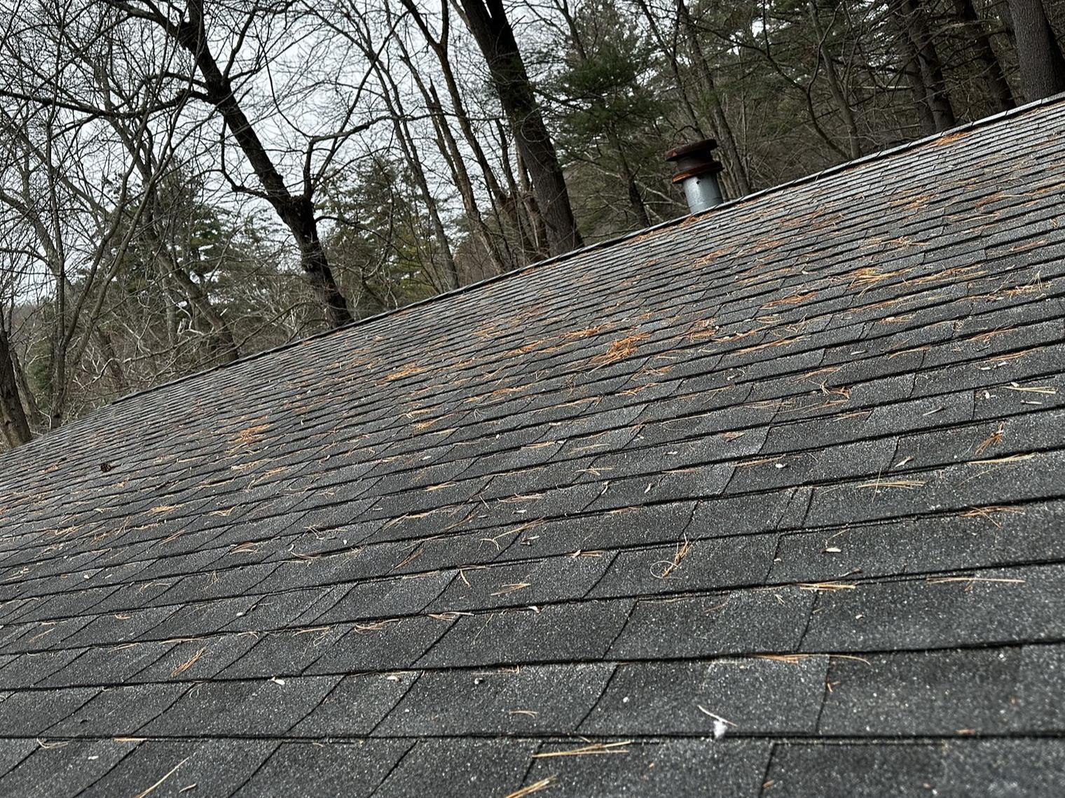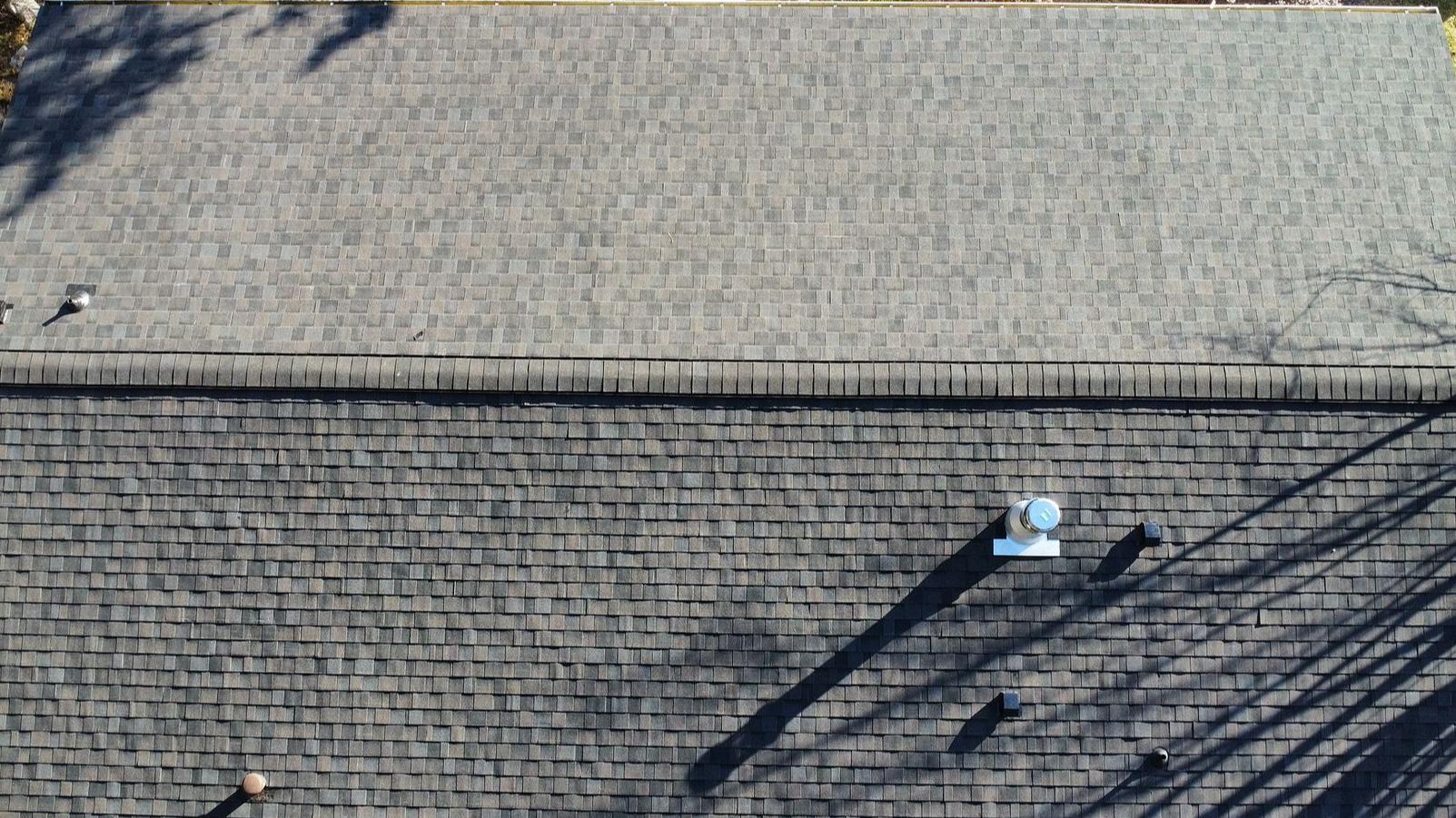 From the inspector’s point of view, the original roof was showing clear signs of age and deterioration. The shingles had widespread organic growth, visible staining, and surface wear across multiple sections, all of which suggested the roof’s protective integrity was fading. Moss and lichen buildup were holding moisture against the roof surface, and the overall weathered condition indicated the system was no longer shedding water the way it should. Taken together, these issues made the roof increasingly prone to leaks and future water intrusion. In the after photo, the home was transformed with brand-new IKO Dynasty Granite Black shingles, giving the roof a clean, uniform appearance and dependable new protection.