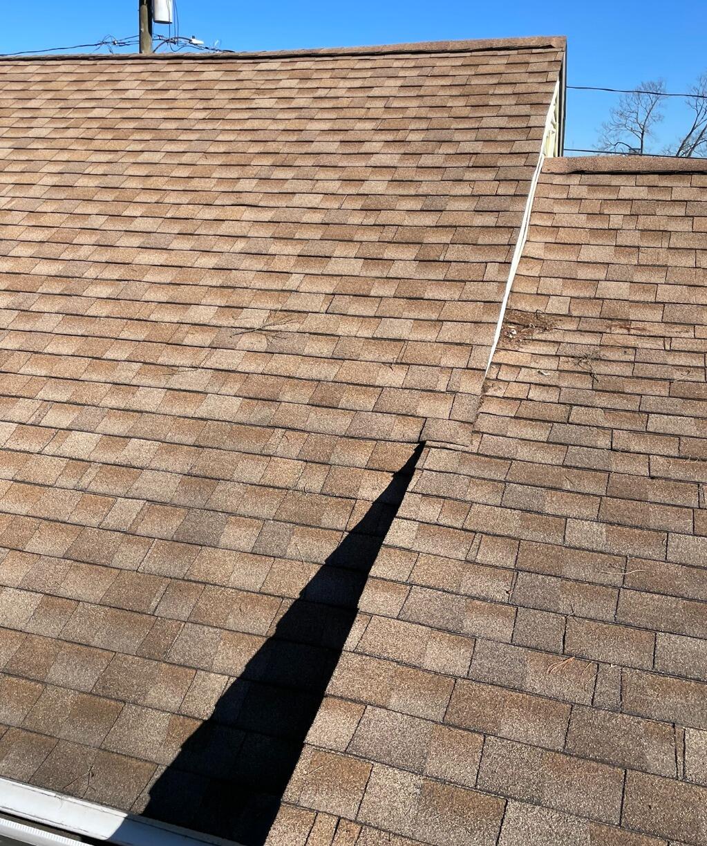 Before: Inspector Geoffrey’s examination of this roof showed vulnerable transition areas where the roofing sections met, with worn shingles, debris buildup, and an exposed opening that could allow water to work beneath the system. When critical tie-in areas begin to separate like this, the home is left in jeopardy of roof leaks and ongoing water damage.