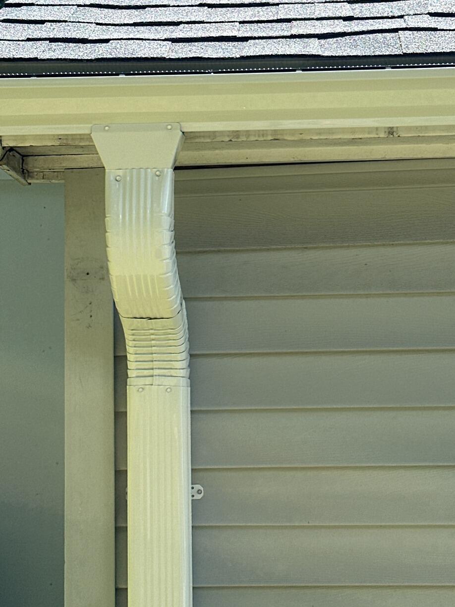 The Brown Roofing team installed 52 feet of white gutters around this entire home. This customer's choice to use the Gutter Shutter system will pay off in continued protection against water damage. These new gutters are larger and more durable than the old gutters, as shown in the above photos.