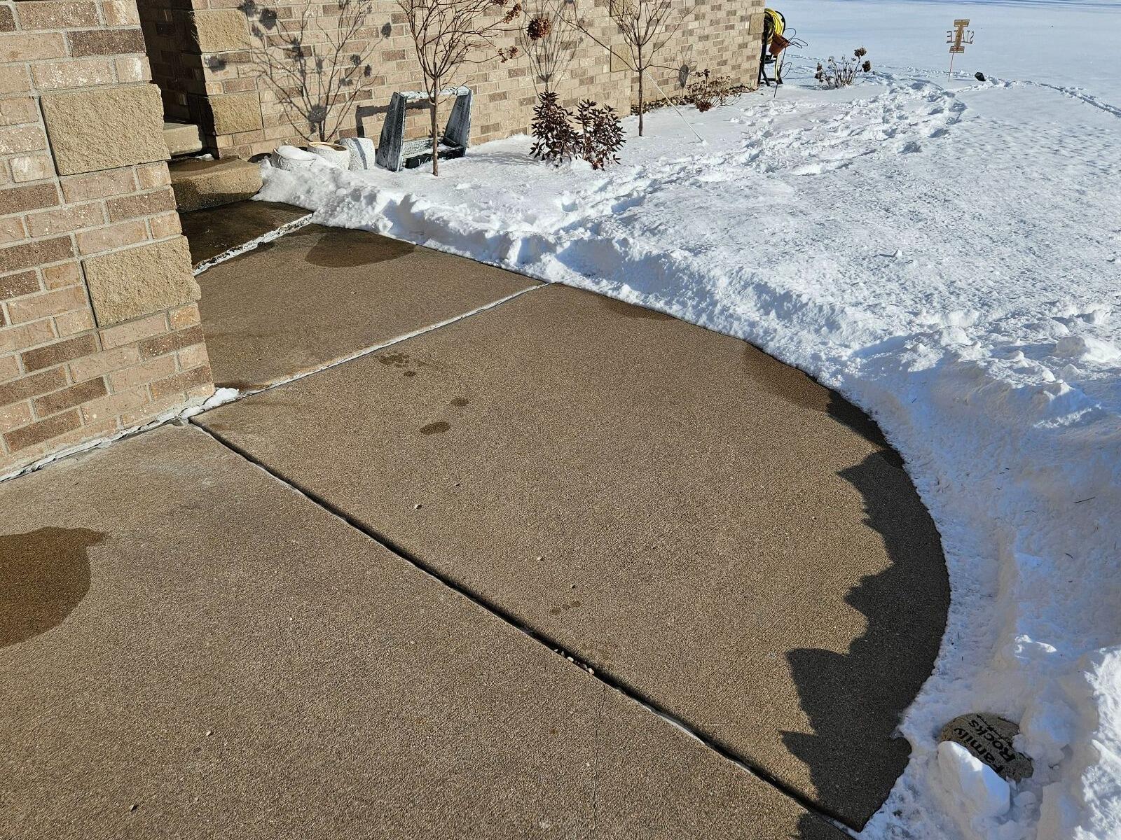 Jason has been having issues with water pooling on his sidewalk due to sinking areas of the concrete. He was unsure how it would be fixed because it was a special and unique pour that had been designed just for his home. He contacted many concrete lifting companies for suggestions on how to fix the issue. Each company had a solution, but all had a downfall of large, discolored solutions that would distract the eye to the injected area. When Cole from MidAmerica Basement Systems arrived to offer him PolyLevel, Jason was still hesitant. Cole continued to discuss the PolyLevel solution with small 5/8th injection sites that are covered to match the rest of the concrete so the end result does not distract the eye. PolyLevel will also lift, level, and stabilize the sunken slab to prevent water from pooling in the area. The once 5-inch sunken concrete, no longer pools with water and is back to level.