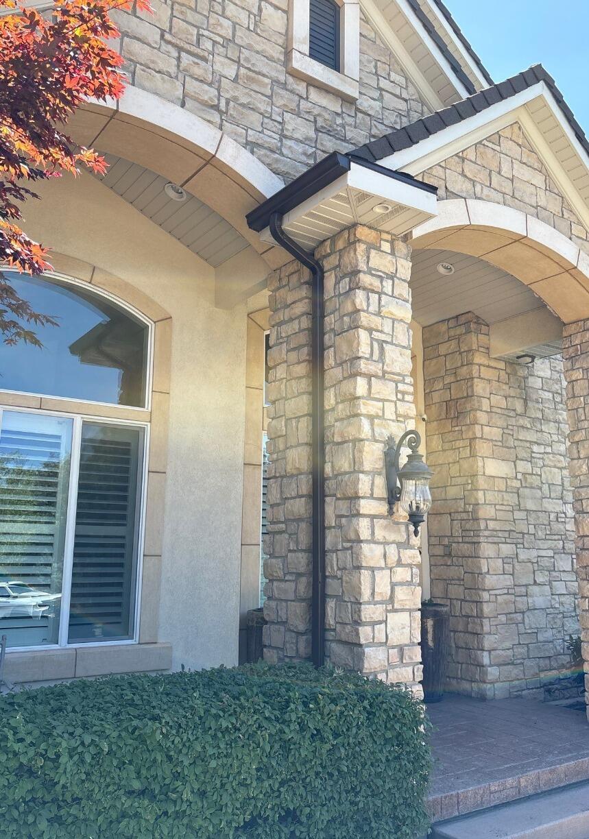 This Draper home featured white gutters that clashed with the stone façade and showed visible wear. The original downspouts also blended too closely with the stucco, taking away from the home’s natural warmth and contrast. We replaced them with seamless brown gutters and downspouts that complement the roofline and tie in perfectly with the dark trim and natural stone.